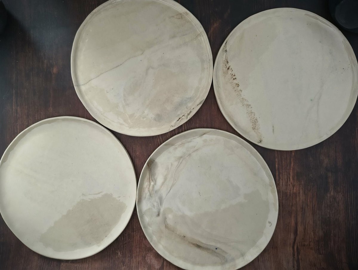 Assiette à dessert en grès marbré. Email transparent. Le dessous des assiettes est brut.